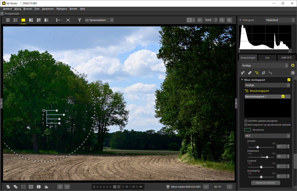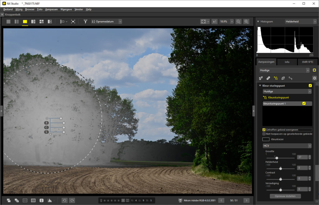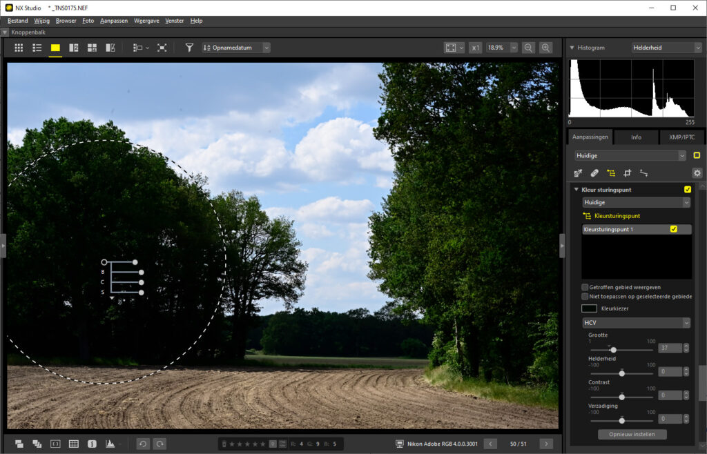 De laatste methode is het selecteren van een gebied in de foto, waarbinnen je de belichting aanpast. Figuur 5 laat dat zien in NX Studio (klik op de figuur voor een groter beeld). NX Studio laat alleen cirkelvormige keuzen toe. Gimp en andere software geeft meer mogelijkheden, ook op JPG-bestanden. Het gekozen gebied (“kleursturingspunt“) is niet scherp afgebakend om al te drastische overgangen aan de rand van zo’n gebied te voorkomen.