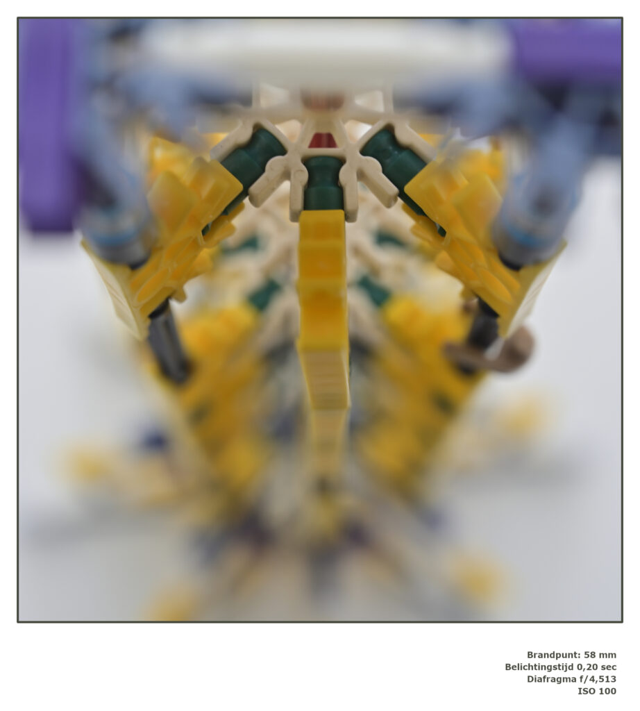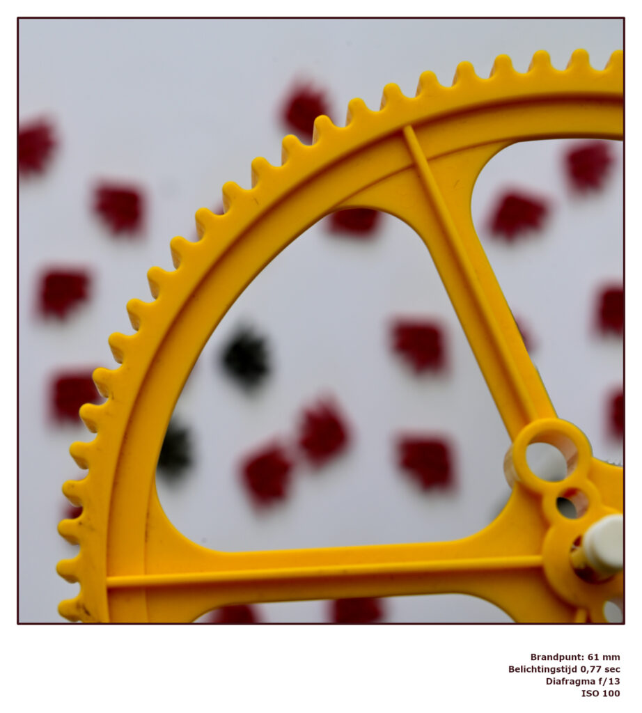 De opdracht voor oktober binnen de werkgroep Mixed Focus was “Bokeh”. Ik heb besloten om voor dat onderwerp wat te spelen met de instelling van het diafragma. Hieronder zie je het resultaat van zo’n experimentje: met steeds scherpgesteld op het grote tandwiel heb ik een reeks foto’s gemaakt met steeds een groter diafragma. Ongeveer een halve meter onder dat tandwiel lagen een aantal rode k’nex-stukjes die ik onscherp in beeld het bokeh wilde laten representeren.