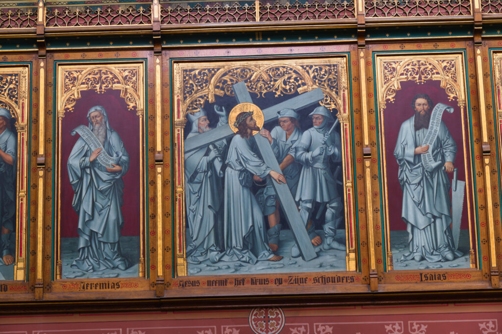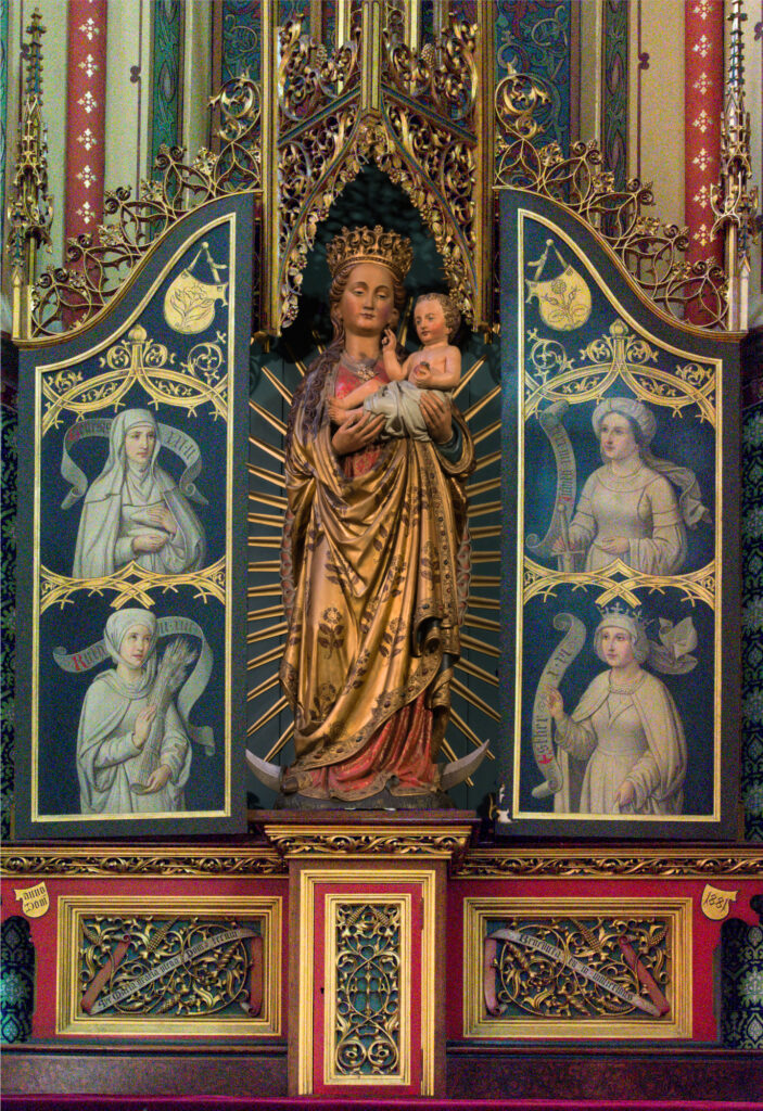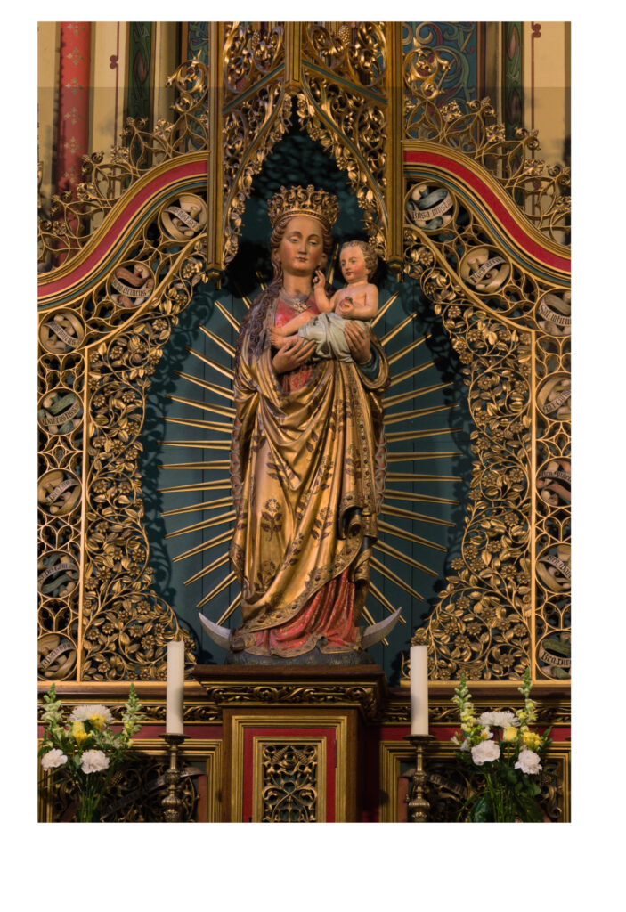 Een probleem bij het maken van de foto’s was dat een foto van het Maria-altaar met gesloten luiken en het beeld zichtbaar niet mogelijk was. Ik heb daarom twee foto’s moeten combineren: